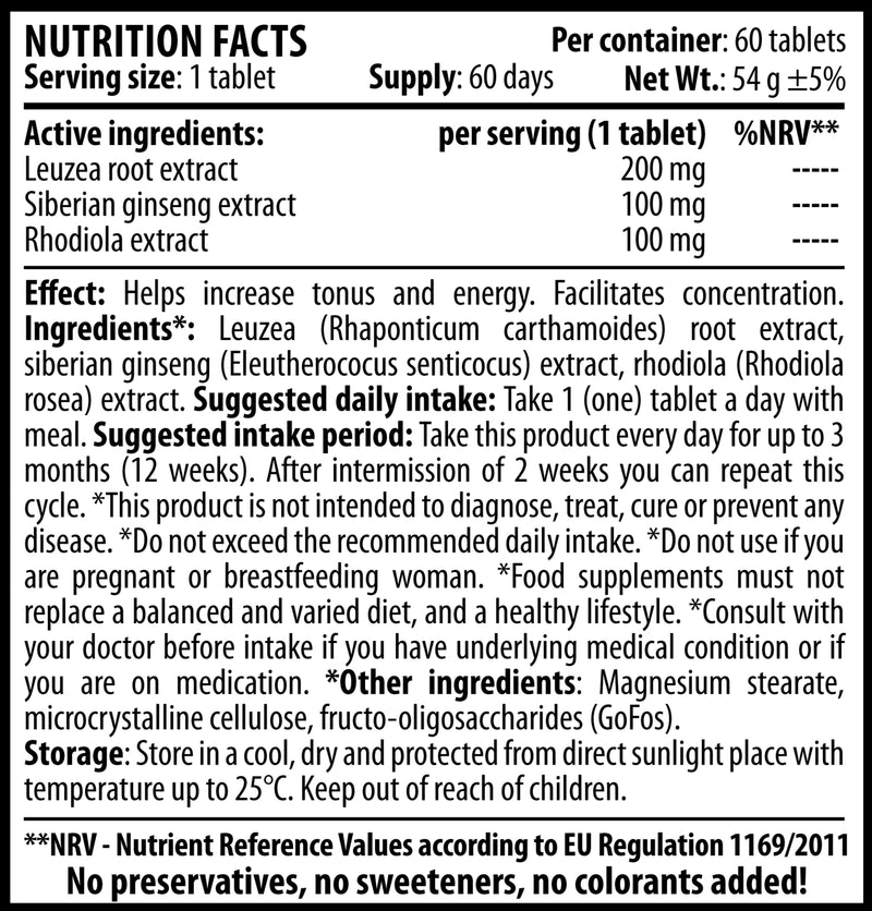 Leuzea supports muscle tone, strength, and healthy protein synthesis. You notice steadier energy through the entire day and improved motivation. Stress impacts you less, and your mood becomes more stable and positive.